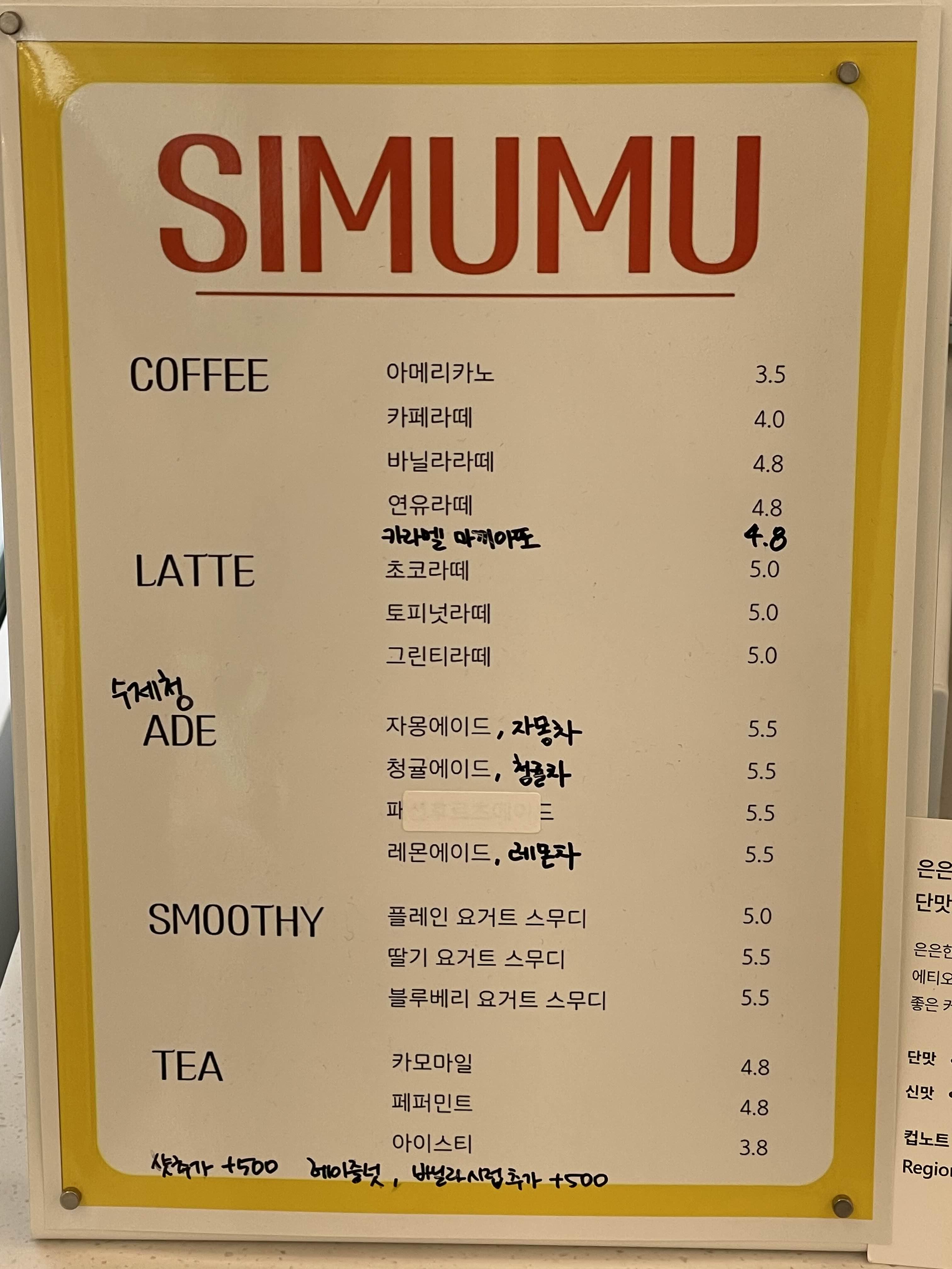 시무무의 전반적인 음료 메뉴는 많이 없었어요! 그래도 기본적으로 다들 무난하게 즐기는 음료는 다 있네요 ㅎㅎ