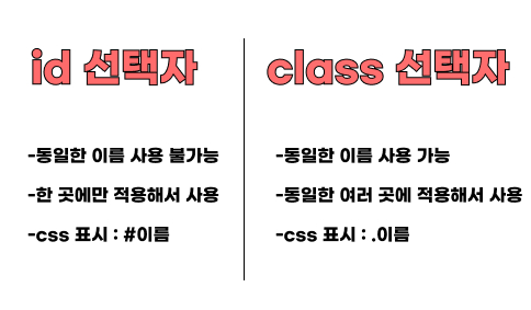 그 중에서도 id 선택자와 class 선택자가 무엇인지, 둘의 차이점은 무엇인지 알아보겠습니다.